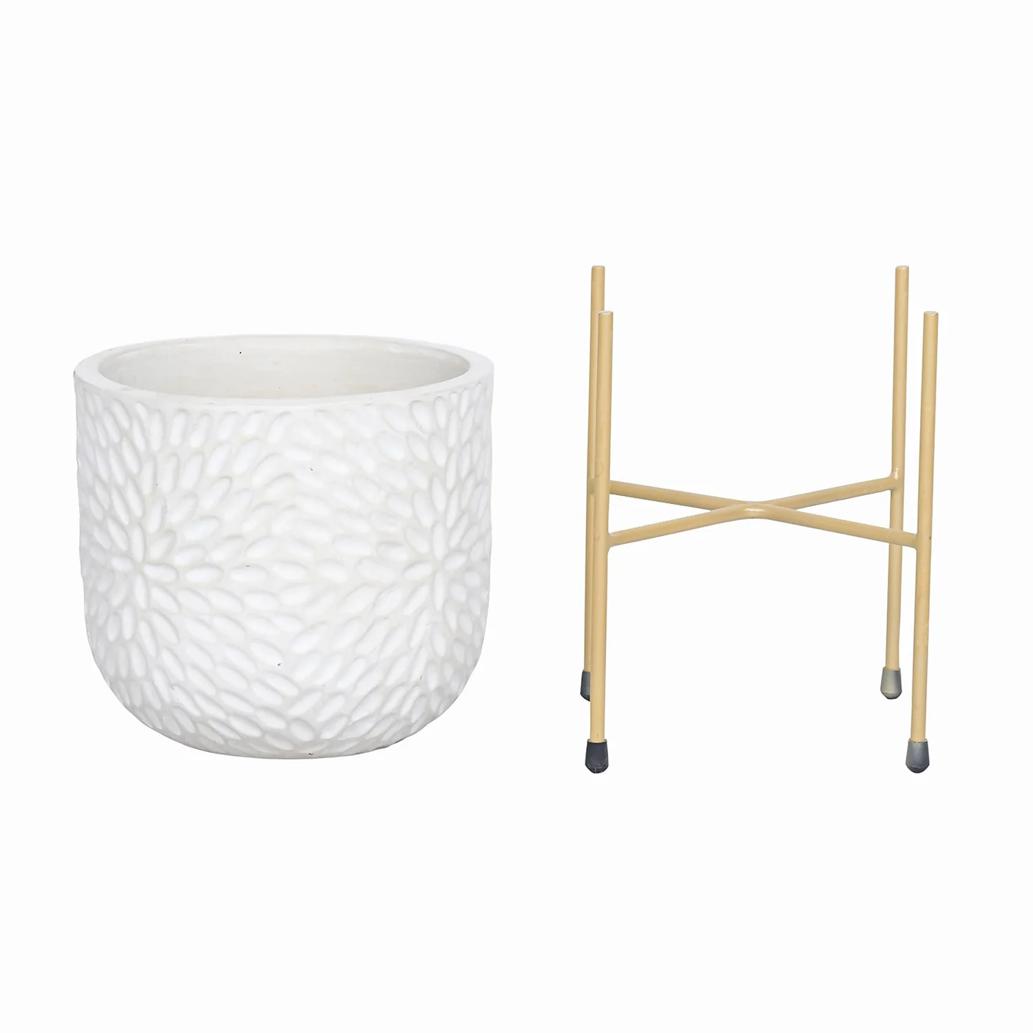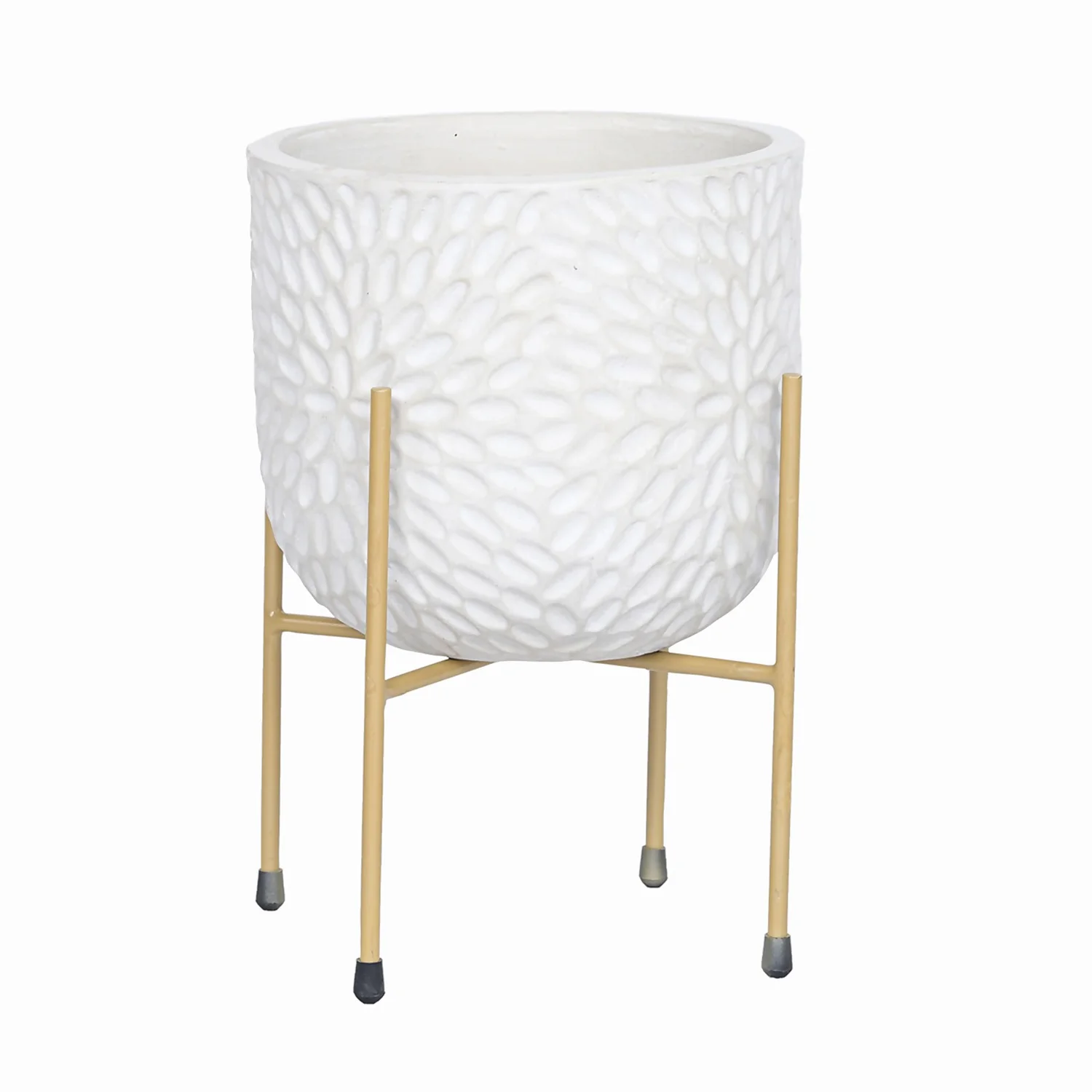 This beautiful large white debossed ceramic planter supported by a gold metal stand is a perfect way for bringing warmth & greenery to your home.