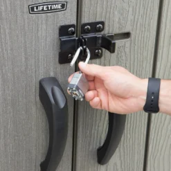 Decluttering your garage and maintaining your yard can be a challenging task. Whether you need a space for yard tools or other equipment, you need the right solution to keep everything organized. Lifetime’s Rough Cut™ Vertical Shed offers an excellent space to store a variety of items around your home. The Rough Cut™ finish features a wood grain texture that provides the natural look and feel of wood without the maintenance of painting or staining. It is also UV-protected and weather resistant. The shed frees up valuable space in your garage by providing plenty of room for bigger items like rakes, brooms, shovels, storage totes, bins and even most push mowers. The durable, impact-resistant build, steel-reinforced walls, and lockable doors (lock not included) provide plenty of protection for your belongings. With the Lifetime Vertical Shed, you can keep your yard looking organized and pristine.